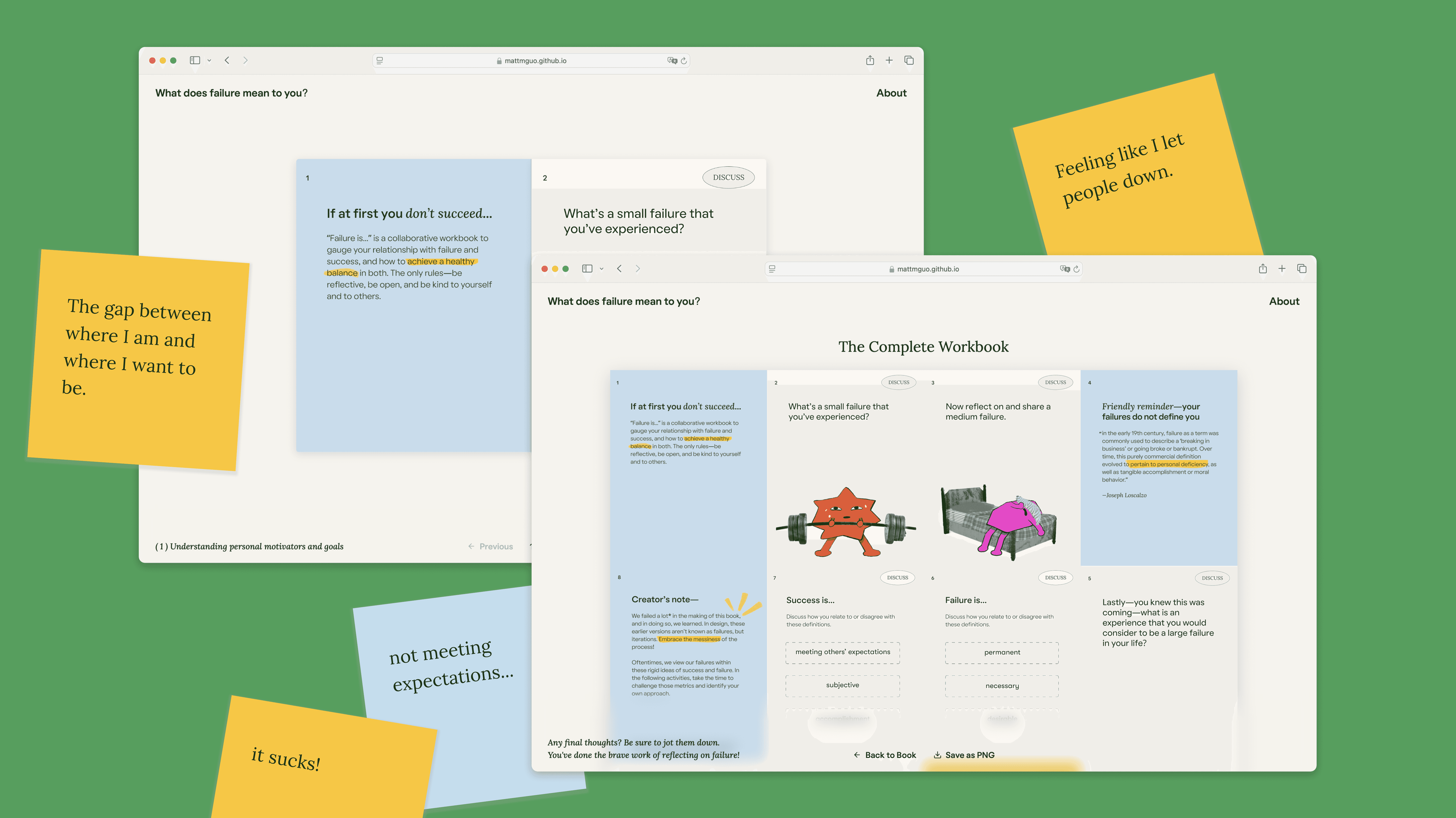 The site opens with a wall of notes reflecting on what failure means to different people. These responses come directly from user research we conducted while exploring the problem space. I chose to surface these perspectives as a way to prime visitors’ mindsets before they dive into the workbook itself. Visitors can also contribute their own reflections by adding a note to the wall. The experience is powered by a Supabase backend, allowing responses to be added and shared in real time.